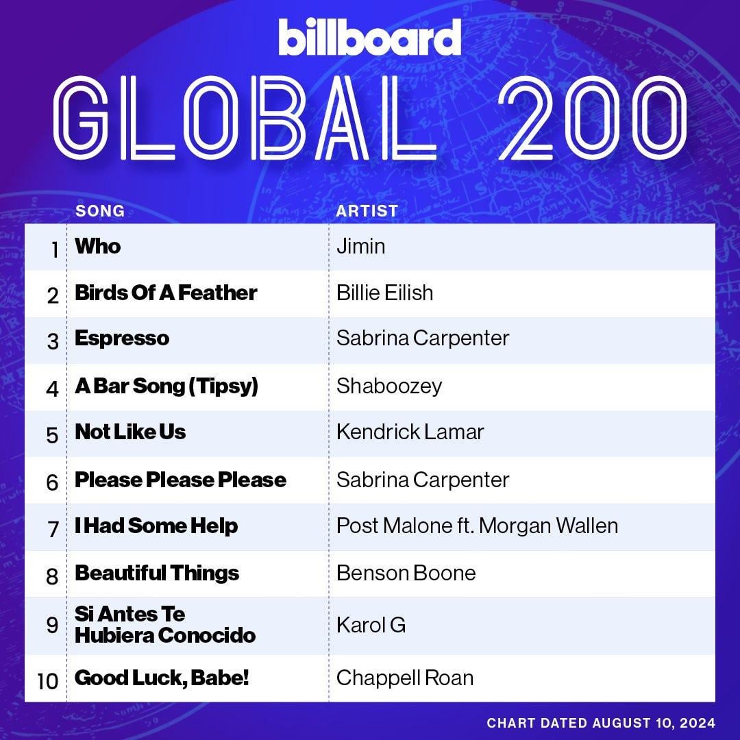 Jimin’s “Who” remains for a second week at #1 on Billboard’s Global 200 and Billboard Global Excl. US Charts – 060824