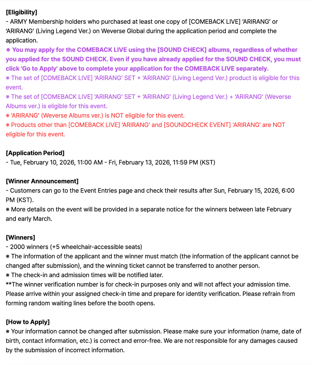 February 10, 2026 share[NOTICE] BTS THE COMEBACK LIVE | ARIRANG Event for Weverse Global Pre-order Customers – 100226