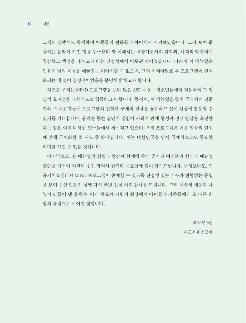 >Finally, I would like to express great thanks to my co-authors, who dedicated themselves to the writing and publication of this manual with me, and to the CEO of Hakjisa [Publishing Company,] Kim Jinhwan, who readily supported us. Above all, I once again offer my sincere gratitude to Min Yoongi, whose heartfelt donations and unchanging company allowed the Min Yoongi Treatment Center and MIND Program to come into existence. The waves created by his artistic talent and his giving will continue to echo as different waves of hope to the children and families at the site of treatment and independence.